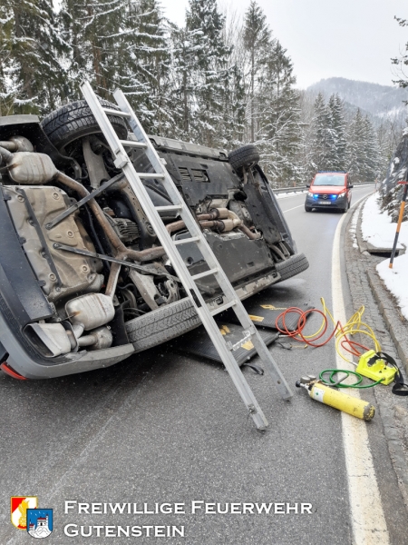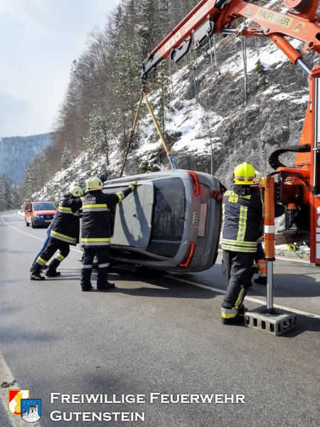 Am 19. März 2021 um 11:30 Uhr wurde die FF Gutenstein zu einer Fahrzeugbergung auf den Rohrer Berg alarmiert. Am Unfallort angekommen stellte sich heraus, dass ein Auto aus unbekannter Ursache auf der Seite zum Liegen kam. Personen kamen nicht zu schaden.Da das Unfallauto zu nahe an der Felswand zum Liegen kam, konnte es die FF Gutenstein mit ihrer Ausrüstung leider nicht aufstellen und so wurde die FF Oed mit den SRF (Schweres Rüstfahrzeug) nachalarmiert.
