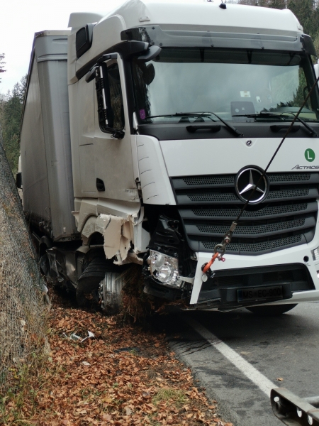 Ein slowenischer LKW-Lenker kam nach eigenen Angaben aufgrund von Sekundenschlaf von der Fahrbahn ab und streifte dabei die Felswand entlang der B21, dabei wurde die Zugmaschine so massiv beschädigt, dass eine Weiterfahrt aus eigener Kraft nicht mehr möglich war. Nach Absicherung und Erkundung musste festgestellt werden, dass eine Bergung mit den Möglichkeiten der Feuerwehr nicht möglich war, somit wurde ein Privatunternehmen hinzugezogen, welche die Bergung des Sattelzuges gegen 10:00 abschließen konnte.
