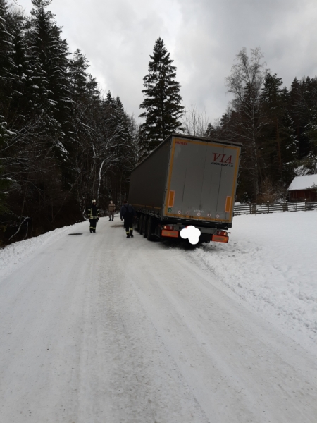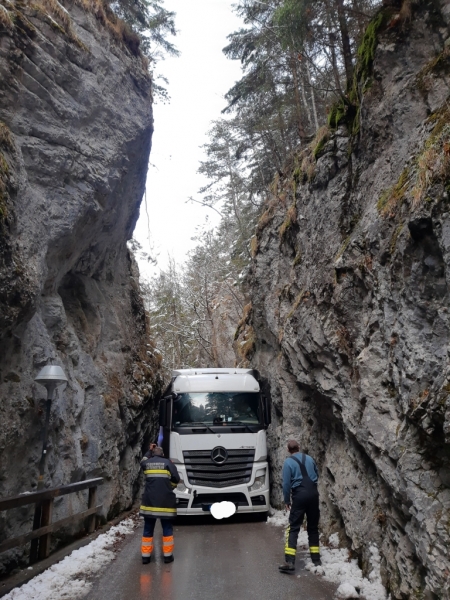 KRFA-B (Rüst Gutenstein) zog den Sattelschlepper ein Stück zurück um ihn danach nach vorne mit der Seilwinde aus seiner misslichen Lage zu befreien. Nachdem der Sattelschlepper wieder flott gemacht wurde, hatten wir noch ein problem - das Nadelöhr lange Brücke, sie ist für diese Art Lkw nicht gemacht.