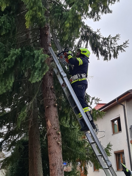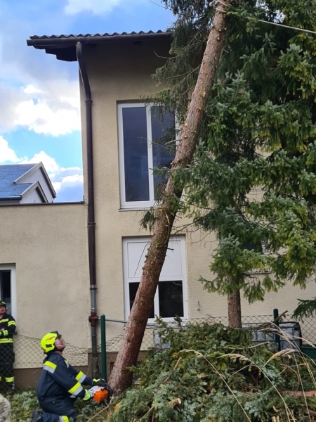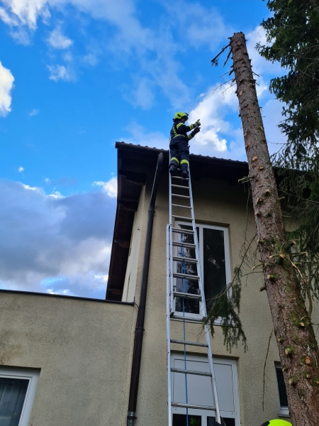 Am Einsatzort machte sich der Einsatzleiter ein Bild der Lage. Danach wurde der abgebrochene Teil des Baumes vorsichtig vom Dach entfernt und am Boden entsprechend zerkleinert. Der verbleibende Stamm wurde entastet und gesichert umgeschnitten.