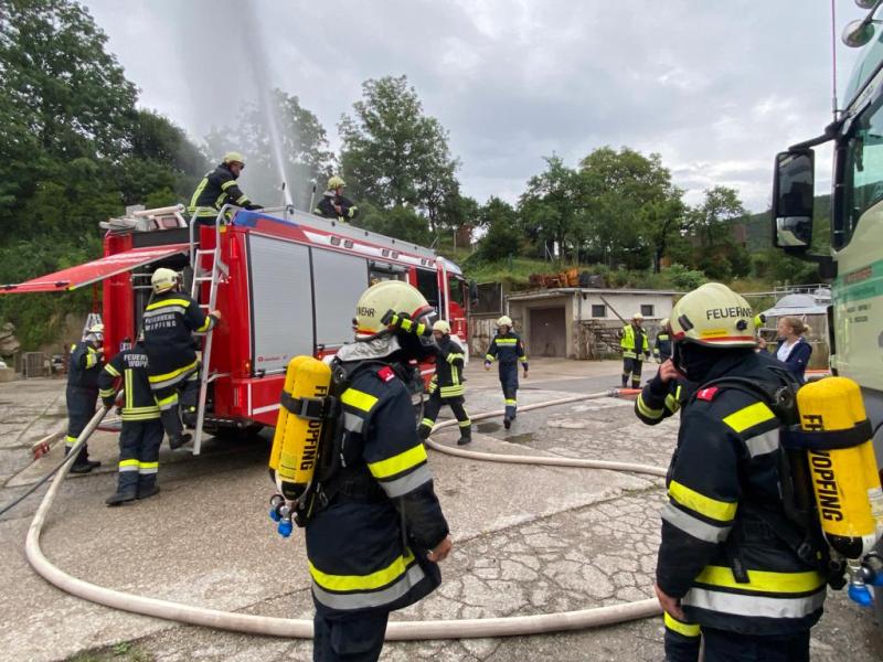 Im Anschluss fand die geplante Übung bei der Firma Kuderer in Wopfing statt. Übungsannahme war ein Brand in der Werkstatt. Mittels schwerem Atemschutz wurden 2 Personen gesucht werden. Weiters musste eine Zubringleitung vom nächstgelegenen Hydranten errichtet werden.