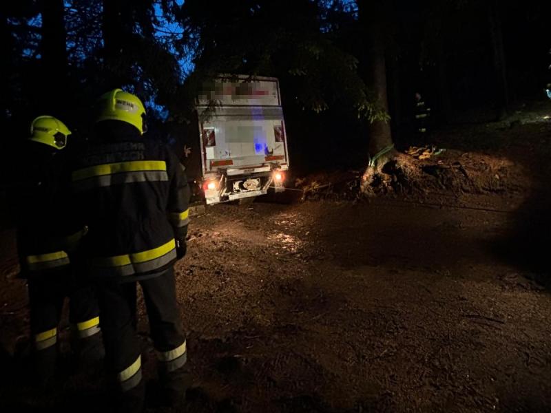Die Mitglieder der FF Krumbach zogen den LKW mithilfe der HLF3-Seilwinde zurück auf die Zufahrt. Anschließend wurde der LKW mittels Abschleppstange auf den befestigten Güterweg geschleppt.