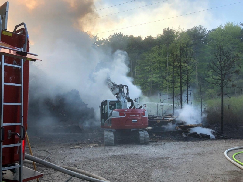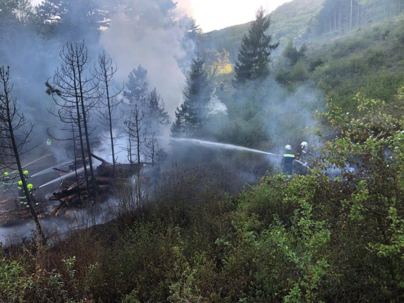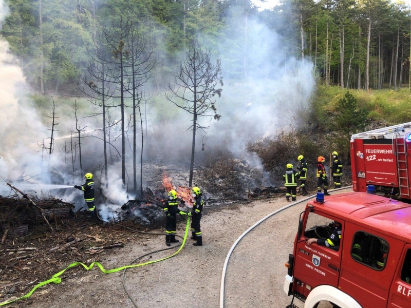 Die anrückenden Feuerwehren meldeten eine zweite Rauchsäule nicht weit vom ersten Einsatzort entfernt. Bei der Erkundung stellte sich heraus das zu diesem Brand bereits die Feuerwehr Hernstein und Aigen ausgerückt sind. Hier waren ca. 200 m² Waldfläche vom Brand betroffen. Beide Brände konnten mit vereinter Kraft um ca. 19 Uhr unter Kontrolle gebracht werden. Es wurde nun eine Saugstelle an der Piesting errichtet um die Ortswasserleitung zu entasten. Mit Hilfe eines Baggers wurde der Holzhaufen verteilt und die Glutnester abgelöscht. Um ca. 21 Uhr konnte Brand Aus gegeben werden.
