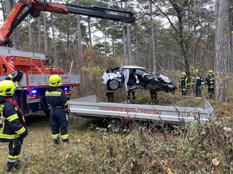 Nach eingeleiteter Suchaktion mittels Polizeihubschrauber und Suchhundestaffel konnte der flüchtige Fahrzeuglenker zuhause aufgefunden werden, um 08:19 Uhr erfolgte die Alarmierung der Feuerwehr Markt Piesting zur Fahrzeugbergung. Ein Lenker aus dem Bezirk Baden dürfte nach einem Streit mit seiner Ehefrau mit dem Fahrzeug der Gattin davongefahren sein. In der Verlängerung der langen Geraden der L4020 Fahrtrichtung Markt Piesting fuhr der Lenker geradewegs in den Wald hinein, schlug dort eine regelrechte Schneise durch die Bäume, hinterließ ein Schlachtfeld an Trümmern und kam mit dem schwerbeschädigt Fahrzeug nach einigen Metern im Wald zu stehen. Der Fahrer kam dabei mit verhältnismäßig leichten Verletzungen davon. Nach Freigabe durch die Exekutive wurde das Fahrzeug geborgen, mittels Kran auf den Abschleppanhänger verladen und anschließend gesichert abgestellt.
