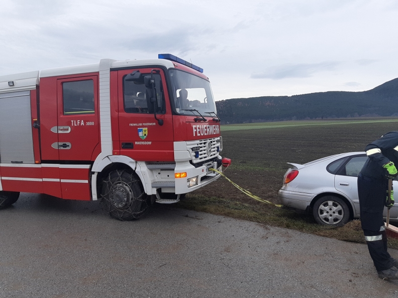 Am 23. Dezember wurde die FF Maiersdorf um 12:38 Uhr zu einem Technischen Einsatz (PKW im Graben) alarmiert. Ein PKW aus unbekannter Ursache von der Fahrbahn abgekommen und danach auf dem angrenzenden Feld auf der Fahrerseite liegen geblieben.