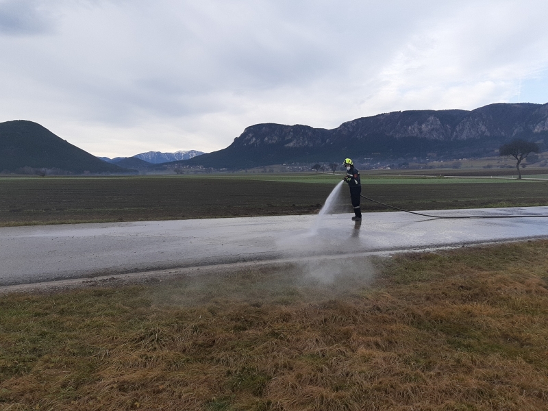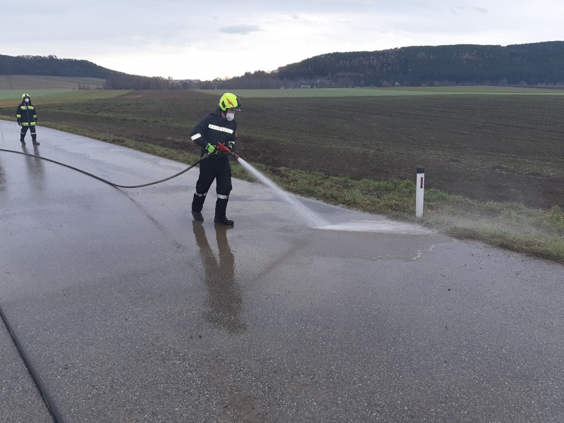 Die Mitglieder der FF Maiersdorf stellten das Fahrzeug wieder auf die Räder und zogen es mittels Einsatzfahrzeug zurück auf die Straße. Nach der Bergung des Fahrzeuges wurde die Straße gereinigt.