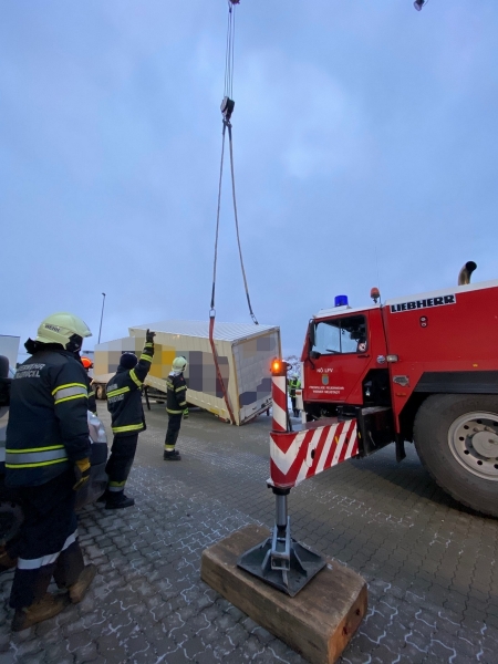 Ein Frachtcontainer samt Inhalt ist vermutlich durch Unachtsamkeit beim Entladen vom WAP Anhänger gekippt. Bei unserem Eintreffen stand der gekippte Container halb auf der Fahrbahn und halb auf dem Anhänger.