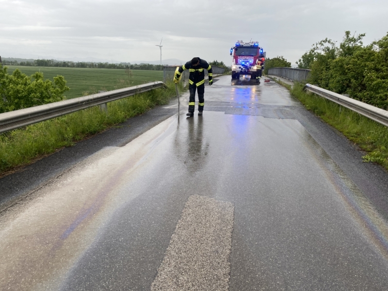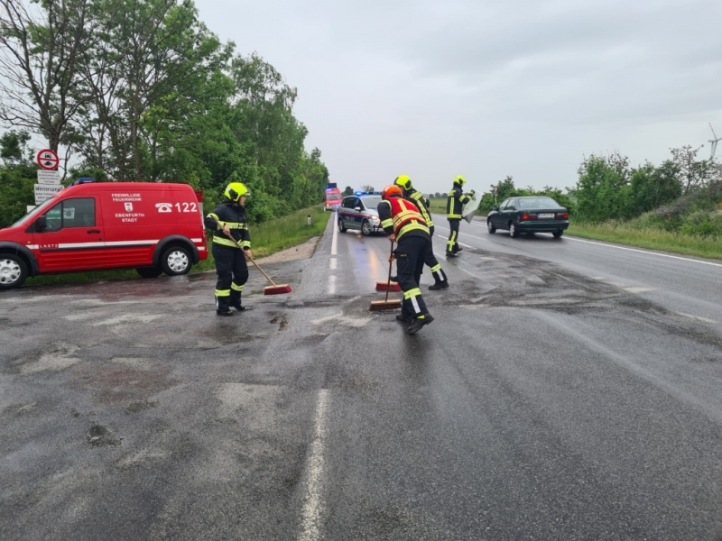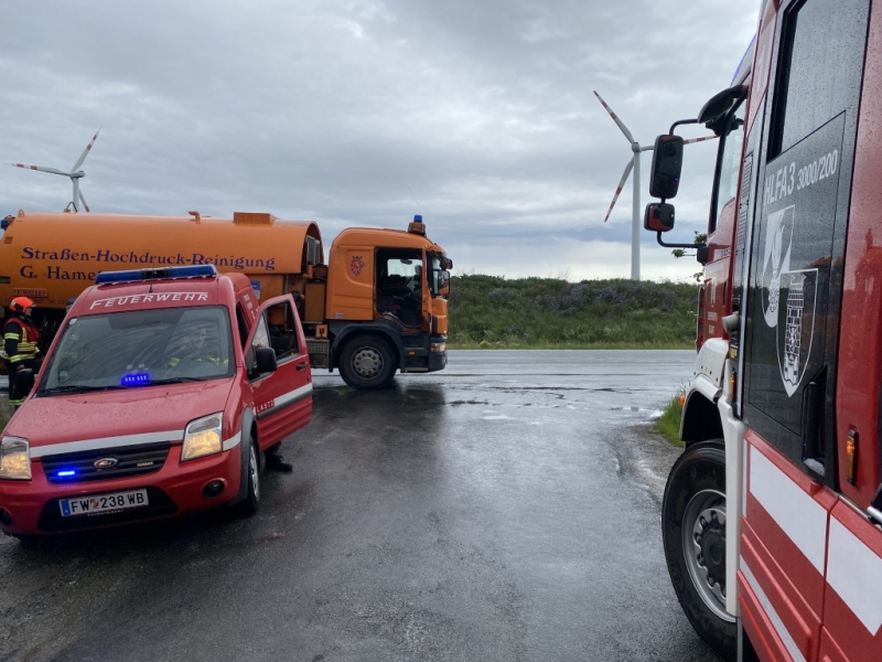 In den Nachmittagsstunden des 27. Mai mussten die Kameraden der Feuerwehr Ebenfurth nach einem Dieselaustritt ausrücken. Teile der B60 und ein Güterweg waren auf mehreren 100m mit Diesel verunreinigt. Durch den starken Regen wurde dieser auf die gesamte Fahrbahn verteilt. Von der Feuerwehr wurde großflächig Ölbindemittel aufgetragen und die Fahrbahn gereinigt. Auf der Bundesstraße wurde die Feuerwehr von der Polizei bei der teilweisen Sperre unterstützt. Dieser Abschnitt wurde im Anschluss an die Straßenmeisterei und eine Fachfirma übergeben. Nach 90 Minuten konnte der Einsatz beendet werden.