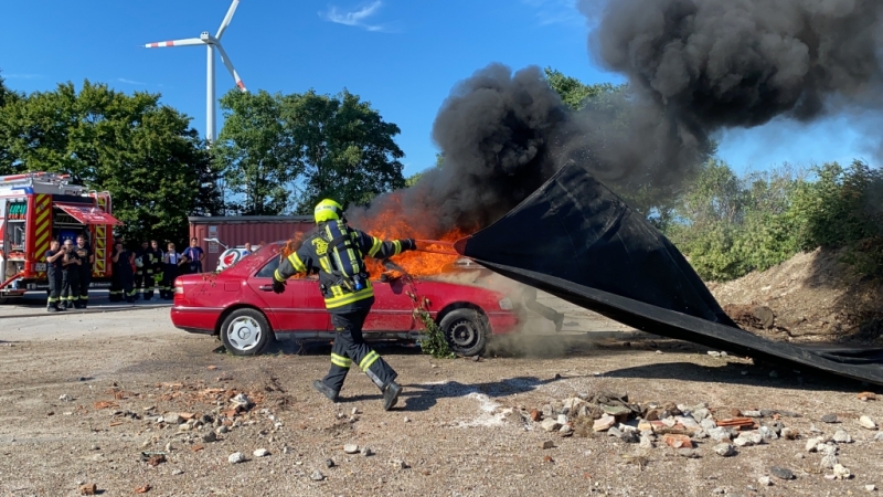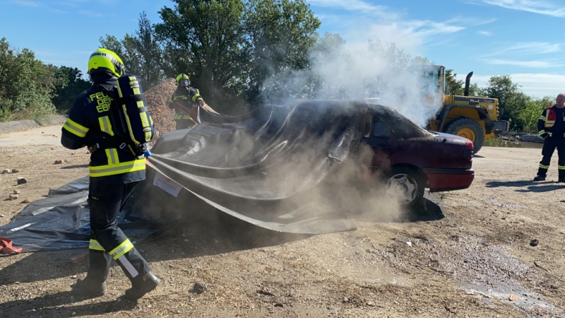Die Größe dieser Decke beträgt 6x8m und sie hält Spitzentemperaturen von 1600°C aus. Über einen längeren Zeitraum hält sie Temperaturen von knapp 1000°C stand. Zwei bis drei Kameraden ziehen diese über einen brennenden PKW und ersticken so das Feuer. Nach knapp 20 Minuten kann sie dann wieder vom Fahrzeug gezogen werden. Es sind anschließend nur noch Nachlöscharbeiten durch die Feuerwehr notwendig.