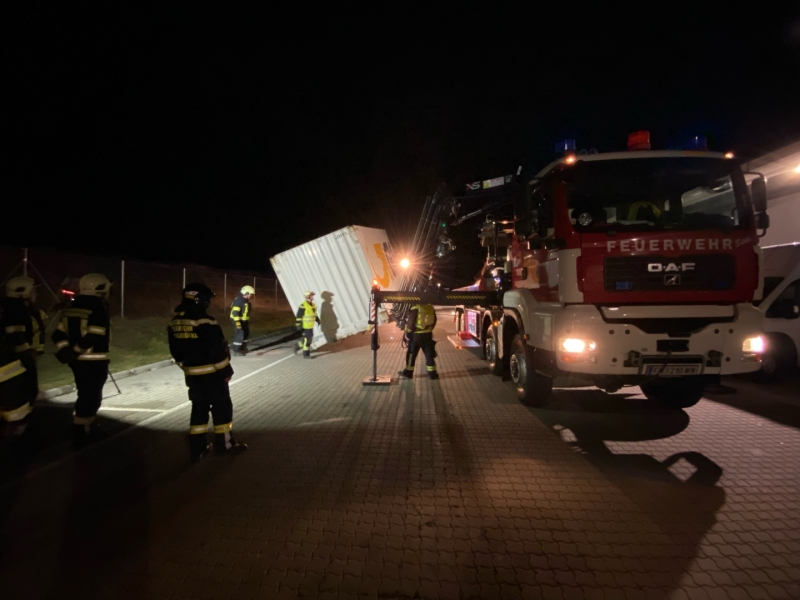 Nach dem das Wechselladefahrzeug mit Kran der Freiwilligen Feuerwehr Wiener Neustadt eingetroffen war, wurde der Container mit dem Kran angehoben und die eingeklappte 4. Stütze montiert und arretiert. Danach konnte der Container sicher und ohne jegliche Beschädigungen wieder auf der Fahrbahn abgestellt werden.