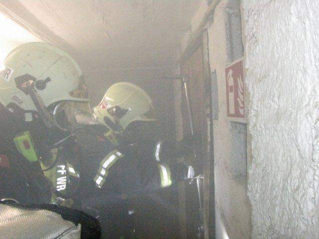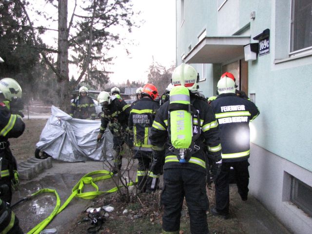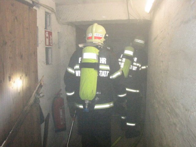 Ein Anrainer meldete gegen 07.20 Uhr eine starke Rauchentwicklung aus einem Mehrparteienkeller in der Fischauer Gasse. Da sich im Feuerwehrhaus am Babenbergerring zu diesem Zeitpunkt noch Feuerwehrleute von einem Fahrzeugbrand zuvor befanden, konnten die ersten beiden Fahrzeuge nur wenige Minuten nach dem Notruf bereits voll besetzt ausrücken. In der Zwischenzeit alarmierte der Diensthabende in der Alarmzentrale weitere Kameraden per Personenrufempfänger. Vor Ort wurde die Erkundung des ersteintreffenden Fahrzeugkommandanten durchgeführt. Zu diesem Zeitpunkt war der Keller bereits vollständig verraucht. Um das Stiegenhaus des Mehrparteienhauses rauchfrei zu halten, wurde beim Kellerzugang ein Rauchvorhang installiert, während sich die ersten Atemschutztrupps einsatzbereit machten. Zusätzlich wurde ein Druckbelüfter eingesetzt. Um den Brandherd zu finden, mussten mehrere Kellerabteile aufgebrochen werden. Schließlich wurde der Brand in einem Abteil gefunden. In Säcken gelagerte Holzpellets entzündeten sich aus noch unbekannter Ursache.