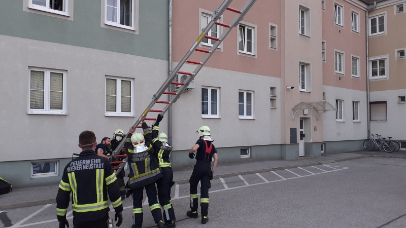 Nachdem Nachbarn Alarm geschlagen hatten, rückten am Abend des 23. Juni Freiwillige Feuerwehr, Samariterbund und Polizei aus, um bei einer älteren Dame im Wiener Neustädter Kriegsspital Nachschau zu halten. Da die Bewohnerin nicht auf Klopfen reagierte, wurde ein Unfall vermutet. Um die Eingangstüre nicht beschädigen zu müssen, drang die Feuerwehr über ein offenes Fenster im zweiten Obergeschoss in die Wohnung ein. Nachdem die Türe von innen geöffnet wurde, konnte die Bewohnerin zur medizinischen Versorgung an den anwesenden Samariterbund übergeben werden.