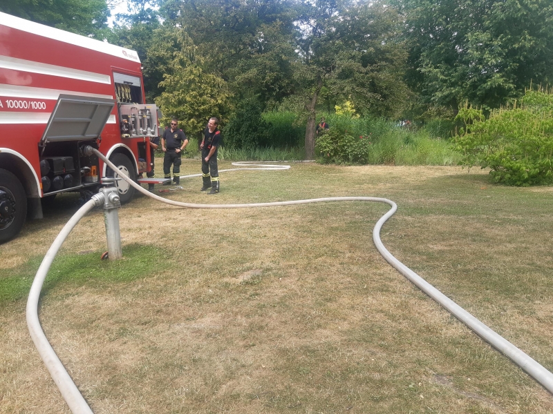 Der Leiter der Gruppe "Wirtschaftshof und Grünraum" DI Thomas Pils rief am Nachmittag des 27. Juni bei der Feuerwehr um Hilfe. Der Wasserstand im Biotop im Stadtpark sank gefährlich ab. Dadurch konnte das Wasser nicht mehr umwälzen und erste Fische verendeten. Die Sonntagsbereitschaft rückte mit zwei Großtanklöschfahrzeugen aus und füllte den Teich wieder an.