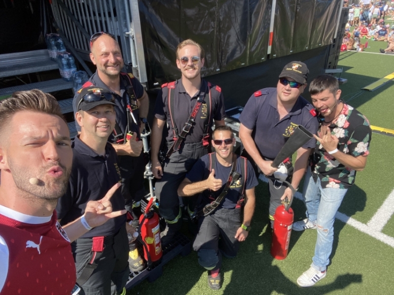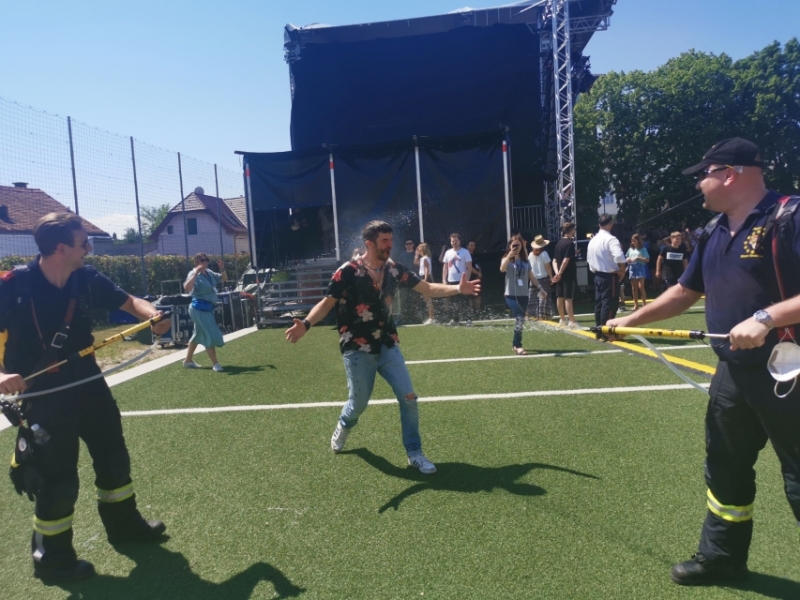 Nach ihrem Auftritt waren natürlich auch die Künstler aufgeheizt. So holten sich auch Pizzera & Jaus am Ende des Konzerts eine Abkühlung bei der Feuerwehr.