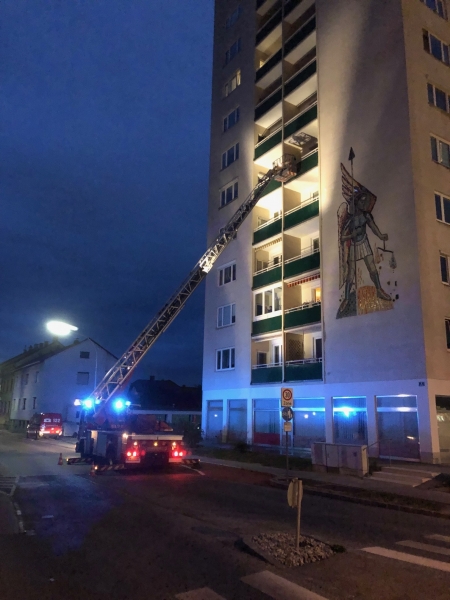 Am Einsatzort angekommen wurde festgestellt, dass man über den Balkon in die betreffende Wohnung einsteigen kann. Das Wasser lief zu diesem Zeitpunkt bereits aus der Wohnung über den Balkon die Fassade herunter. Über die mitalarmierte Drehleiter stiegen die Einsatzkräfte im fünften Stock in die Wohnung ein, welche bereits vollflächig mit Wasser geflutet war.