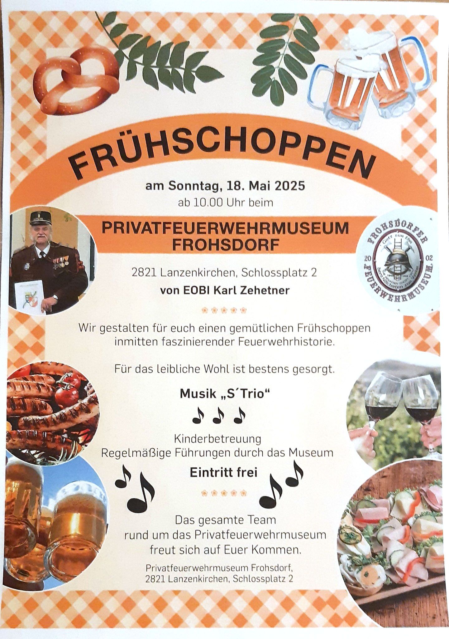 Am Sonntag, den 18. Mai ab 10:00 Uhr lädt das Feuerwehrmuseum Frohsdorf rund um Museumsdirektor EOBI Karl Zehetner herzlich zum gemütlichen Frühschoppen ein – direkt am Schlossplatz 2 in Frohsdorf.