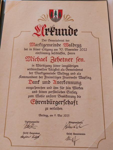 Der Gemeinderat der Marktgemeinde Waldegg hat in seiner Sitzung am 30. November 2022 einstimmig beschlossen, Herrn Michael Zehetner sen. in Würdigung seiner langjährigen verdienstvollen Tätigkeit als Gemeinderat der Marktgemeinde Waldegg und als Kommandant der Freiwilligen Feuerwehr Wopfing Dank und Anerkennung auszusprechen und für sein Wirkung und für seinen persönlichen Einsatz zum Wohle unserer Bevölkerung die Ehrenbürgerschaft zu verleihen.