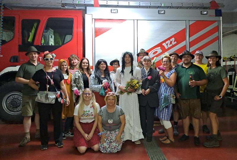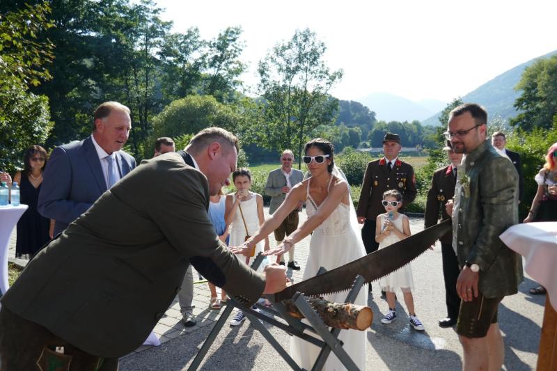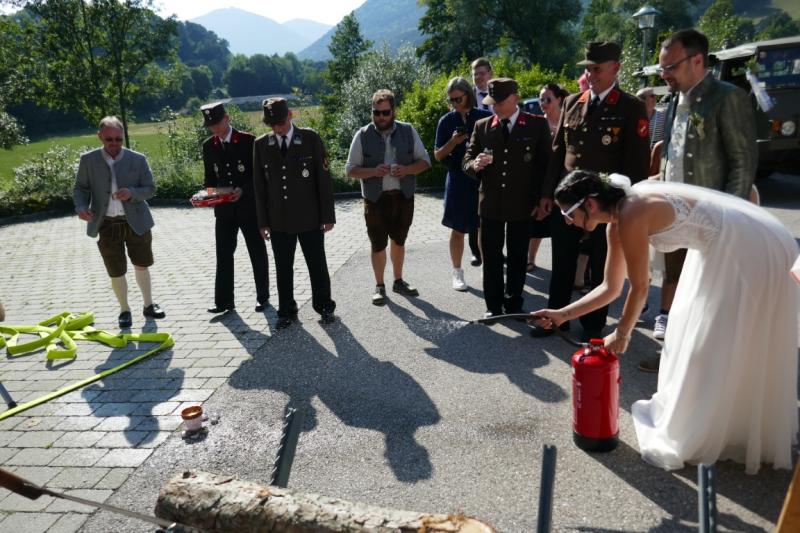 Unter den vielen Gratulanten war auch eine Abordnung unserer Feuerwehr dabei. Unser Kamerad Harald und seine Natascha erfüllten die gestellten Aufgaben (Stamm durchsägen, löschen, usw.) erfolgreich. Die Gäste konnten sich bei der sommerlichen Hitze mit Getränken erfrischen und eine kleine Stärkung zu sich nehmen.