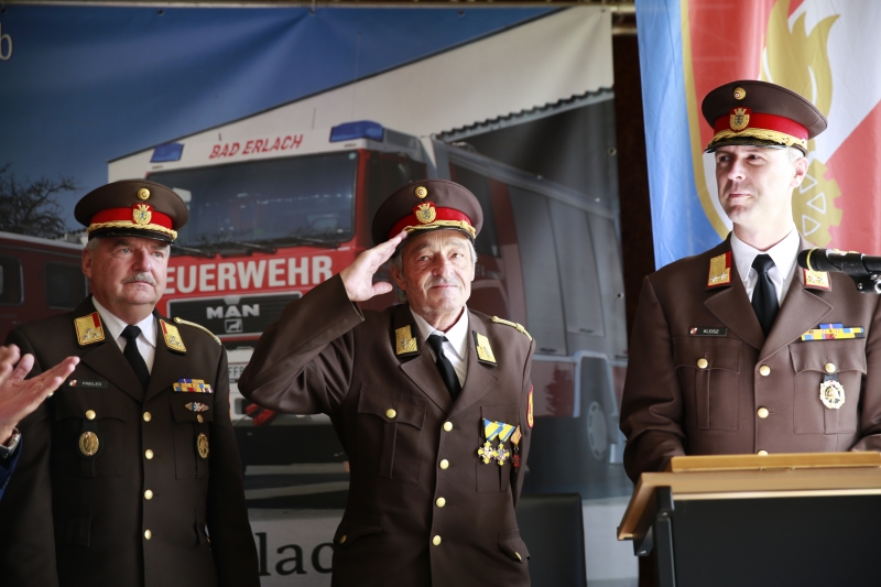 Kommandant HBI Günter Ostermann wurde in Anerkennung seiner Verdienste um die Feuerwehr Bad Erlach vom Bezirksfeuerwehrkommandant OBR Rudolf Freiler das Verdienstzeichen II. Klasse in Silber überreicht.