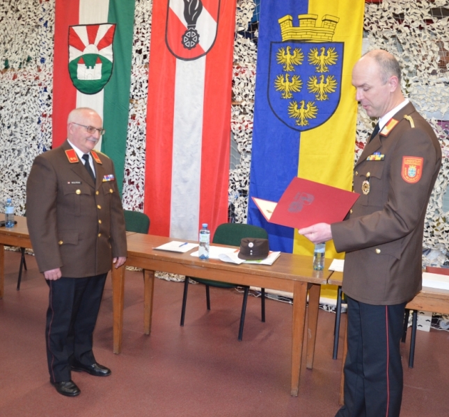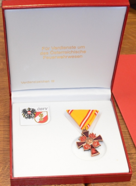 Abschnittsfeuerwehrkommandant BR Roland Kleisz konnte für sein Jahrzehnte langes Wirken im Kommando der FF Eichbüchl OBI Erwin Woltran mit der Verleihung des „Verdienstzeichens 3. Stufe des österreichischen Bundesfeuerwehrverbandes“ überraschen.