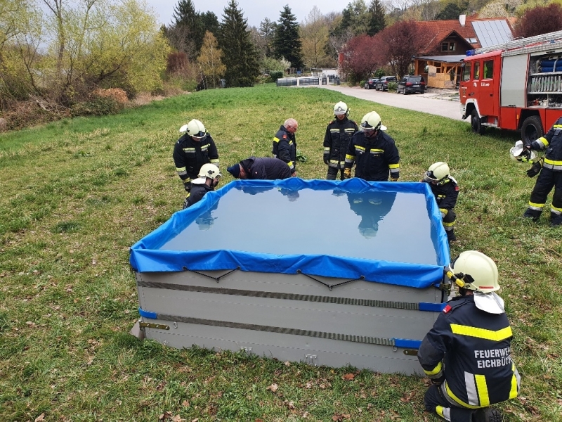 Im Anschluss fuhren wir mit dem Tanklösch- und dem Versorgungsfahrzeug zur Leithafurt, wo wir auf einer Wiese unseren neuen und in Eigenregie vor allem für Wald- und Flurbrände geschaffenen mobilen Wasserbehälter aufgestellt und befüllt haben. Bei dem rund 5.000 Liter fassenden großen Becken sind Faktoren, wie das Aufstellen möglichst in der Waage und die richtige Position des Auslassventils, unbedingt zu beachten. Der mobile Wasserbehälter erfüllt praxisbezogen seinen Zweck.