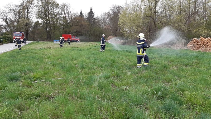 Zum Schluss führten wir eine Brandbekämpfung in Form einer Riegelstellung durch, wobei wassersparend mit 4 D-Hohlstrahlrohren auf einer Angriffsbreite von 70 m nicht nur der fiktive Brand bekämpft, sondern auch das Übergreifen des Brandes auf einen anderen, noch nicht brennenden Bereich, geübt und unterbunden wurde. Die Verwendung der D-Druckschläuche bringen den Vorteil, dass die wassergefüllten Schläuche nicht so schwer sind und daher nur von einem Kameraden betreut und bedient werden können.