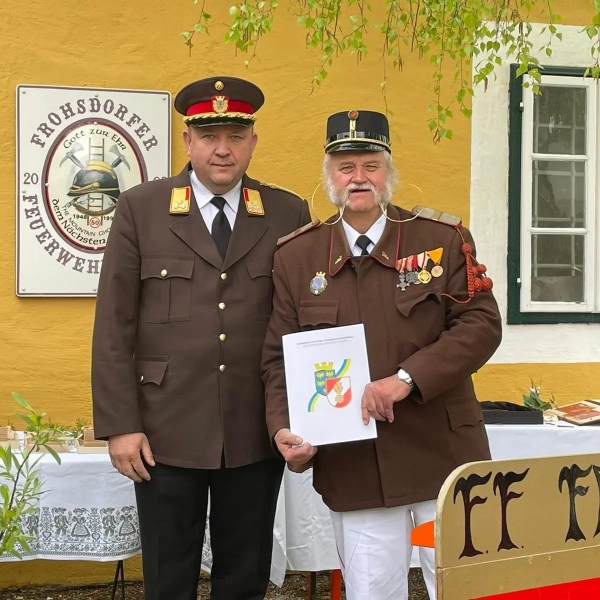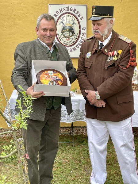 Seitens der Feuerwehren war Bezirkskommandant OBR Karl-Heinz Greiner und vor allem Vertreter der örtlichen FF Frohsdorf anwesend. Bezirkskommandant OBR Greiner überreichte Karl Zehetner eine Dankesurkunde für die Anerkennung seiner Leistungen im Bereich der Feuerwhergeschichte und für das 20-Jahr Jubiläum.