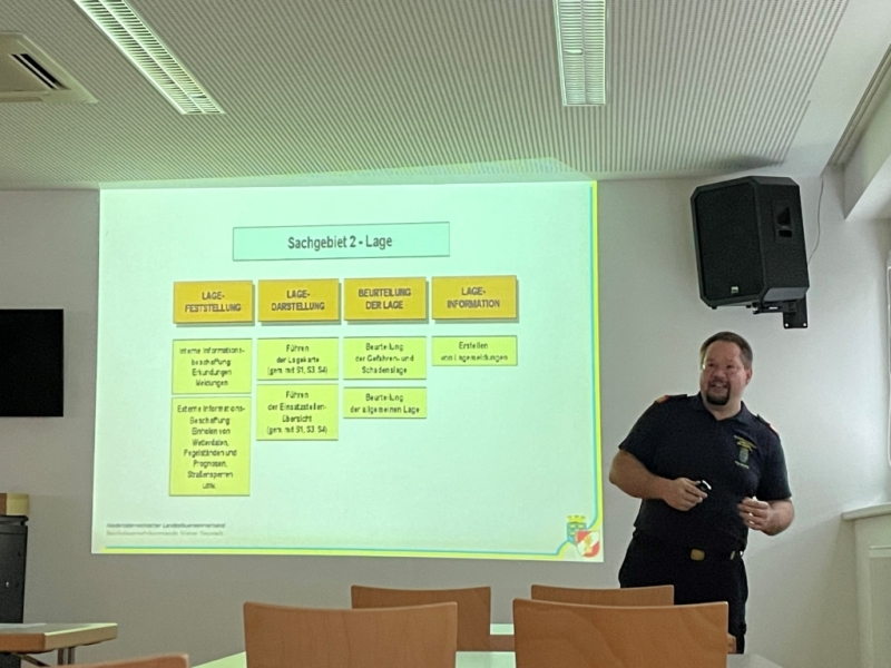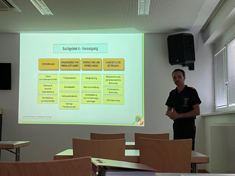 Nach begrüßenden Worten des Bezirkskommandanten eröffnete ABI Florian Bartl den Abend mit einem allgemeinen Vortrag. Er stellte die Aufgaben des BFÜST vor und zeigte anhand vom Praxisbeispiel Großmittel die Arbeit während eines Einsatzes auf.