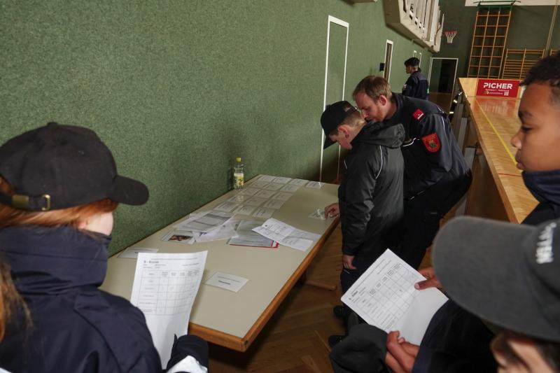 Je nach zu erreichendem Abzeichen gab es die Stationen Testblatt, Kleinlöschgeräte, Geräte für den technischen Einsatz und für den Brandeinsatz, Schutzausrüstung, Dienstgrade, Leinen und Knoten, Zeichen, Handfunkgeräte, das Verhalten im Brandfall und der Umgang mit dem Feuerlöscher.