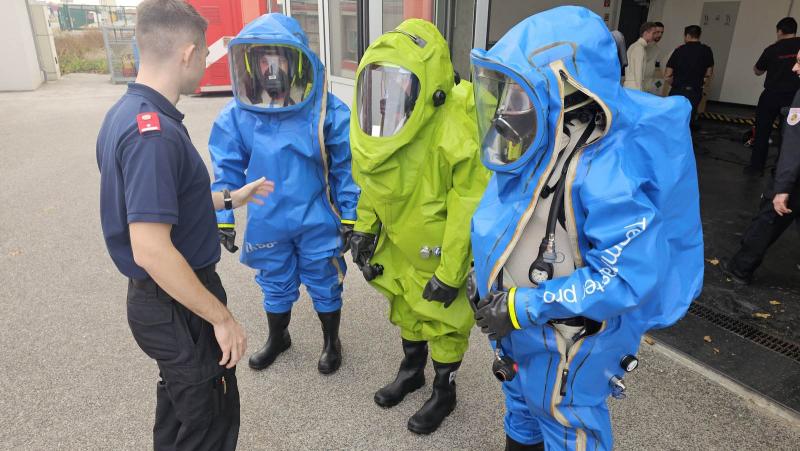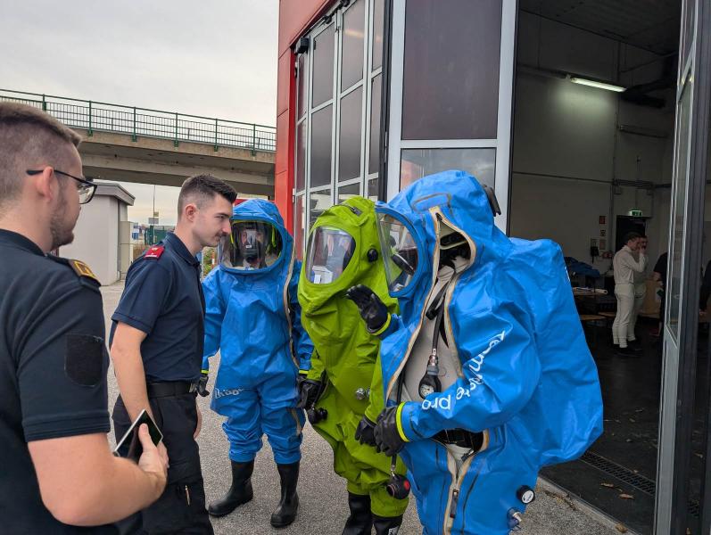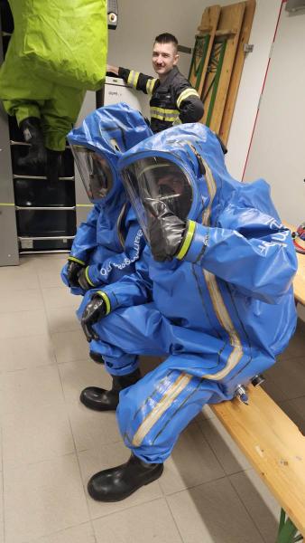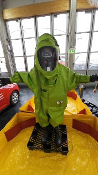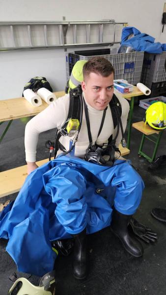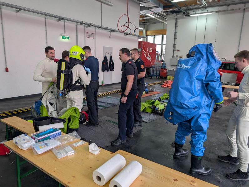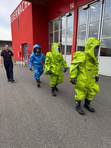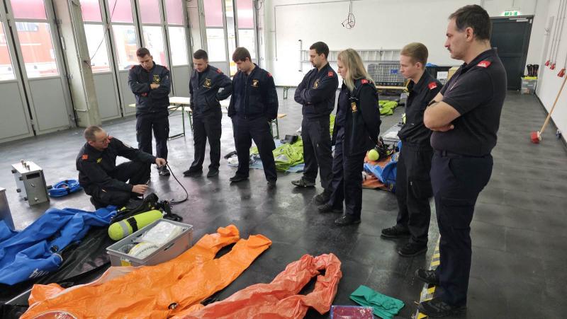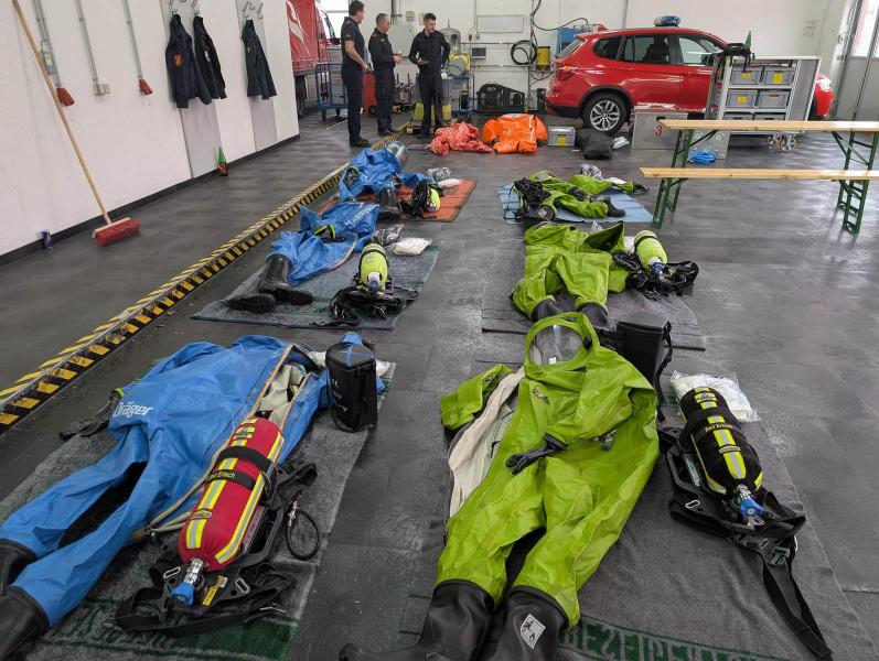 Nach einer fordernden Gewöhnungs- und Belastungsübung wurde eine gemeinsame Mittagspause eingelegt. Anschließend folgte ein weiterer kurzer Theorieblock, der sich mit den Schutzanzügen der Schutzstufe 4 (gasdicht und Hitzeschutz) sowie der Fremdluftversorgung befasste.