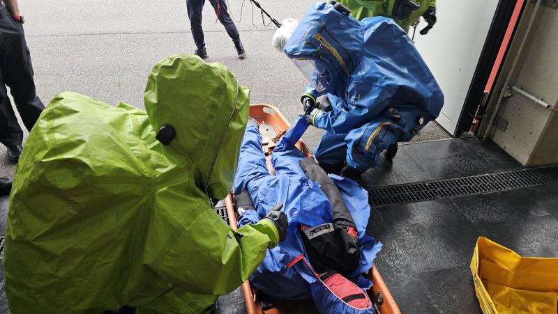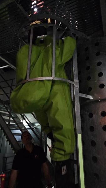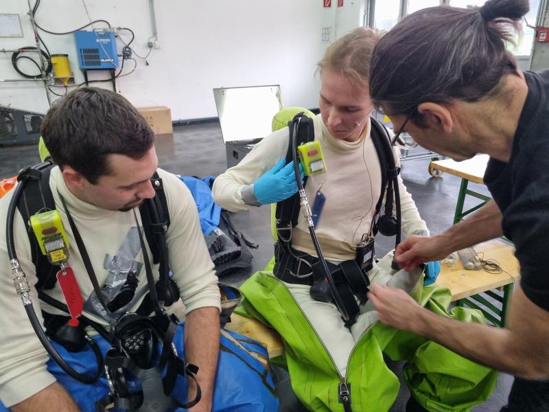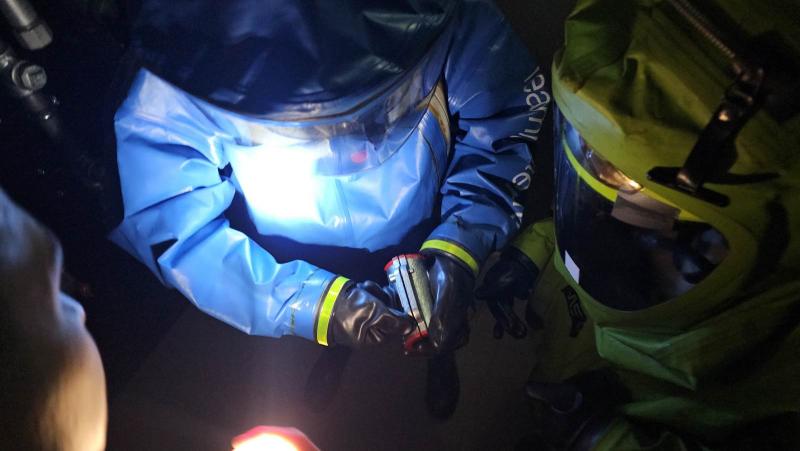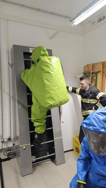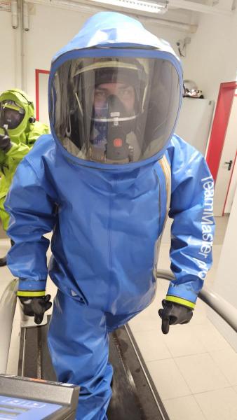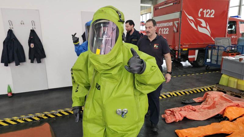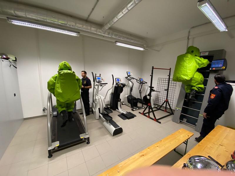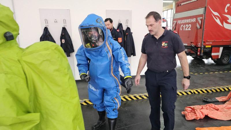 Nach einer fordernden Gewöhnungs- und Belastungsübung wurde eine gemeinsame Mittagspause eingelegt. Anschließend folgte ein weiterer kurzer Theorieblock, der sich mit den Schutzanzügen der Schutzstufe 4 (gasdicht und Hitzeschutz) sowie der Fremdluftversorgung befasste.