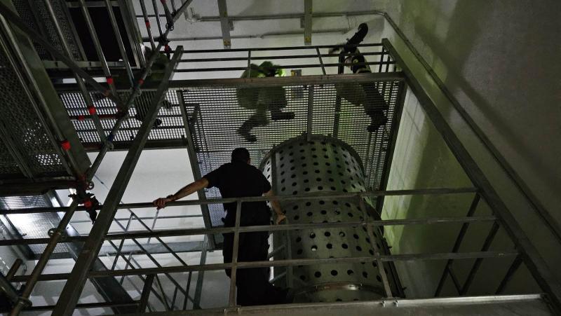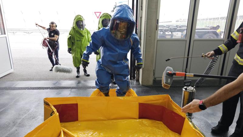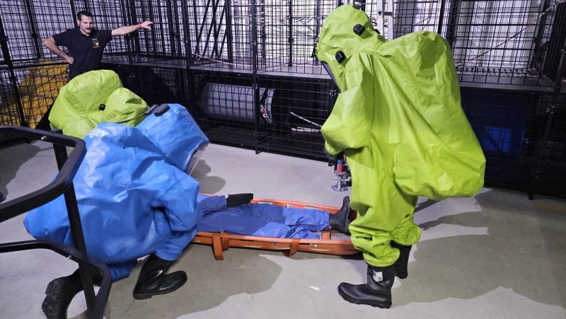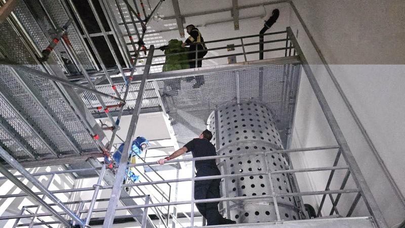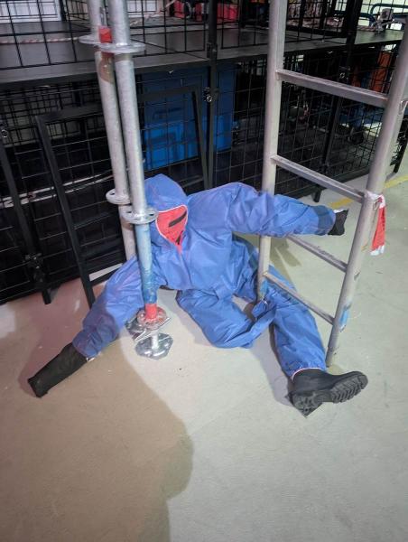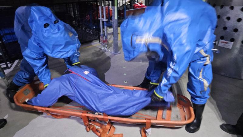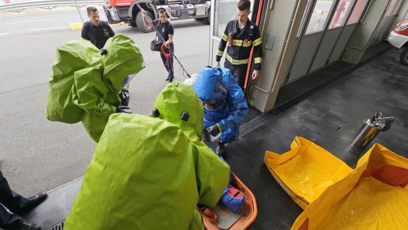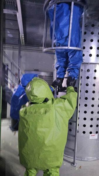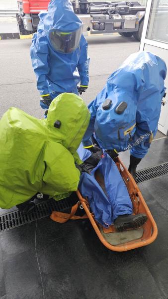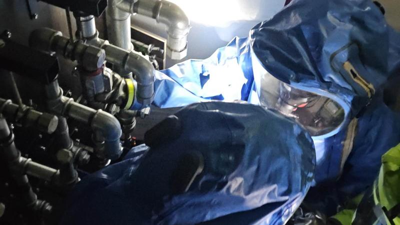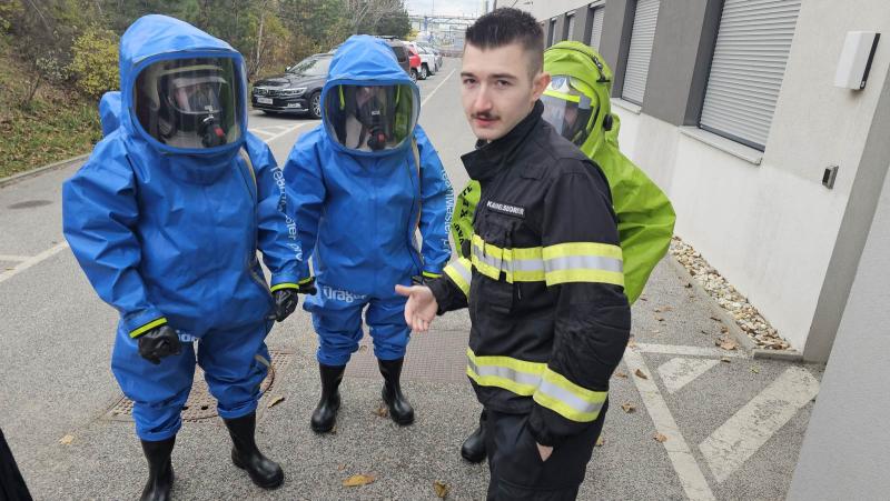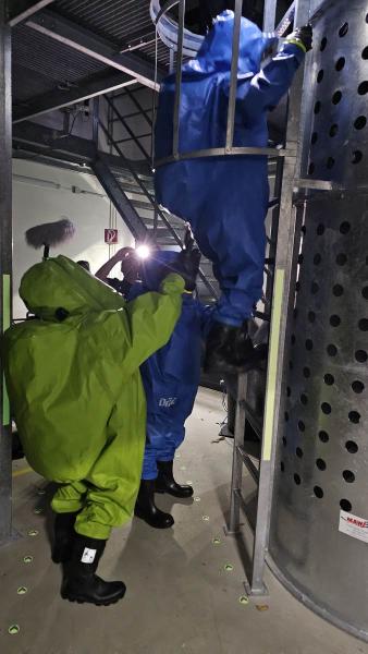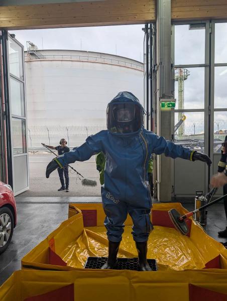 Die abschließende Übung fand auf der Übungsstrecke der BTF Industriepark Schwechat statt. Dabei bestand die Aufgabe darin, nach einem Schadstoffaustritt einen verletzten und kontaminierten Arbeiter zu retten, welcher im Anschluss einer Not-Dekontamination zugeführt wurde. Die Teilnehmenden mussten anschließend über eine Industrieleiter einen Stock höher steigen, um aus dem zweiten Stock zwei Behälter über das Treppenhaus in Sicherheit zu bringen. Danach galt es, einen Flansch zu schließen und eine Leckage an einer Rohrleitung mit einer Rohrdichtmanschette abzudichten. Den Abschluss bildete der Ablauf der Dekontamination, wobei besonderes Augenmerk auf das korrekte Entkleiden gelegt wurde.