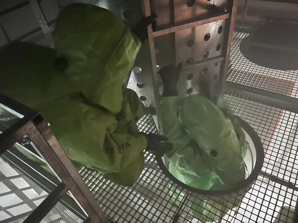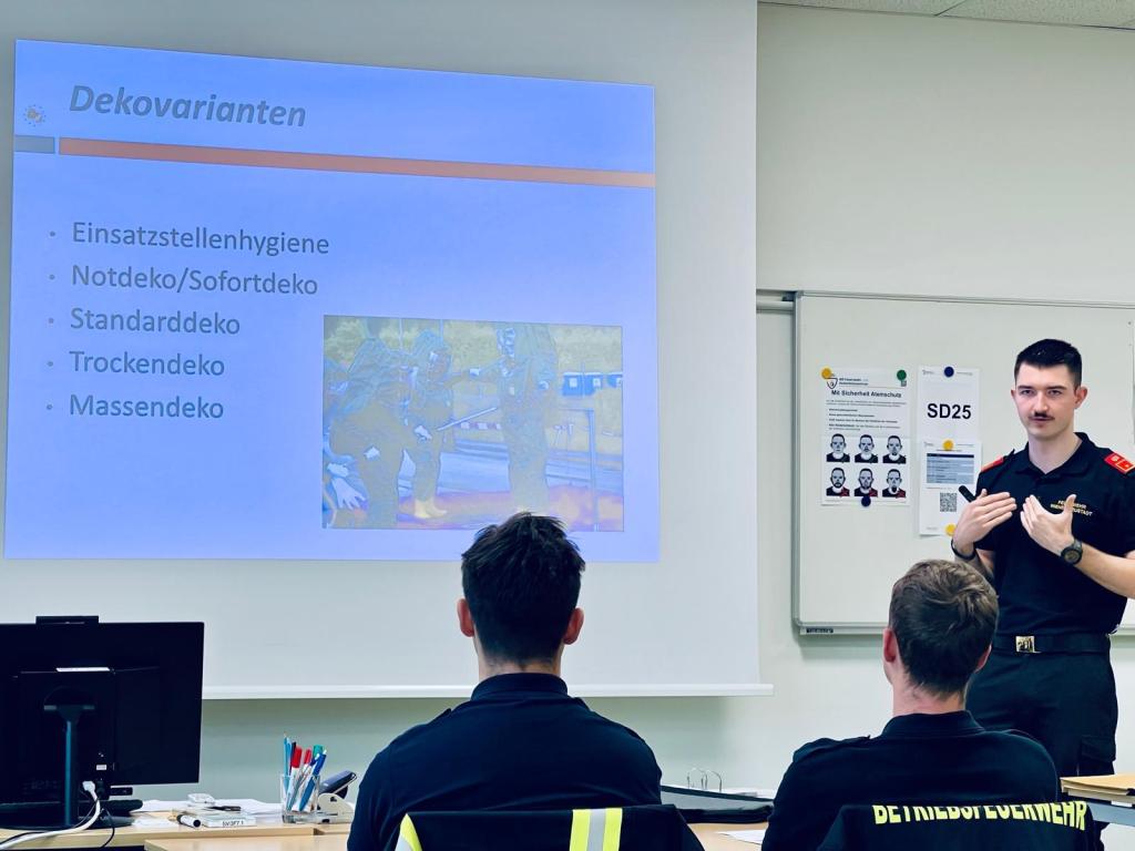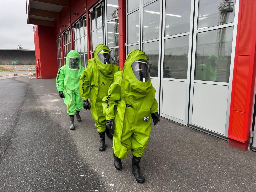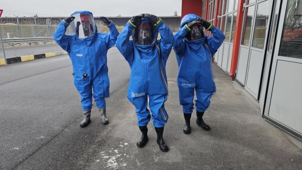 Der Tag begann mit einer theoretischen Schulung am Vormittag, die nahtlos in den praktischen Teil überging. Das Gelernte wurde direkt angewendet: Zunächst überprüften die Teilnehmenden die Schutzanzüge und die Ausrüstung, um anschließend gemäß den Herstellerangaben die Scheiben und Reißverschlüsse für den Einsatz vorzubereiten. Nach einer fordernden Gewöhnungs- und Belastungsübung wurde eine gemeinsame Mittagspause eingelegt. Anschließend folgte ein weiterer kurzer Theorieblock, der sich mit den Schutzanzügen der Schutzstufe 4 (gasdicht und Hitzeschutz) sowie der Fremdluftversorgung befasste.