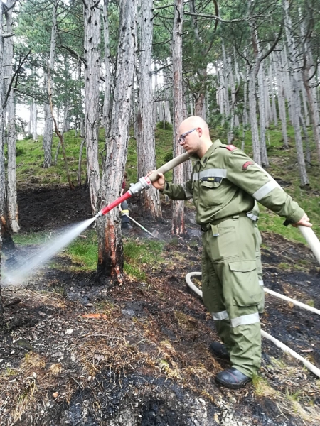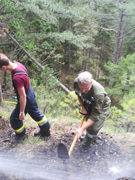 Vom Wind angefacht brach dann das Feuer aus, welches von einem Anrainer bemerkt wurde, der sofort die Feuerwehren alamierte. Um die Wasserversorgung sicherzustellen musste ein Pendelverkehr mit Tanklöschfahrzeugen eingerichtet werden. Die FF Waidmannsfeld-Miesenbach unterstütze die Löscharbeiten mit einem weiteren Tanklöschfahrzeug.