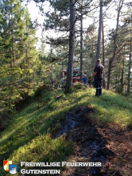 Ein Pilot eines ÖAMTC Rettungshubschraubers meldete am 27. August „Florian 21“ einen Waldbrand westlich vom Jaglgraben in Gutenstein. Nach Alarmierung durch Sirene und BlaulichtSMS, fuhren VF, Tank und Pumpe Gutenstein mit 16 Mann Richtung Lorbeergasse aus, um den Brand zu löschen.