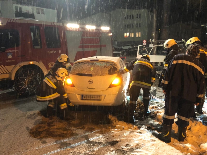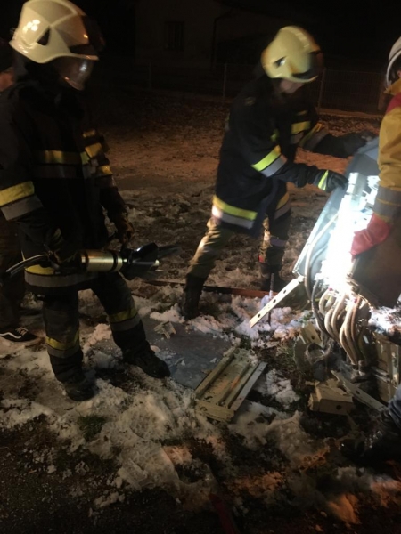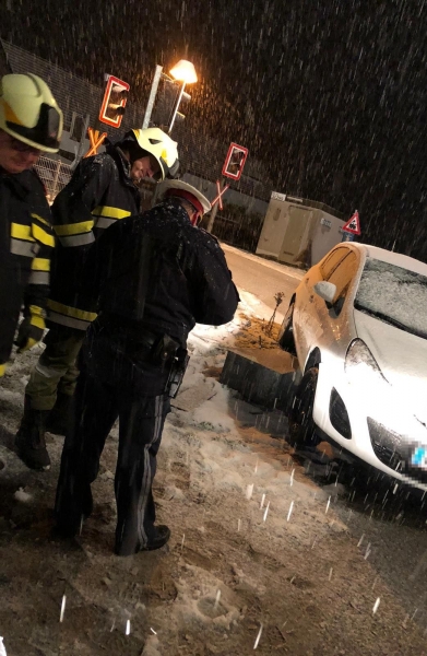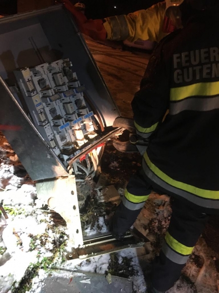 Die Feuerwehr Gutenstein unterstützte die Mitarbeiter der EVN mit Licht, die die Stromzufuhr des Verteilerkasten unterbrachen. Danach konnte das Auto herunter gehoben und gesichert abgestellt werden.