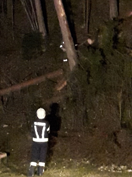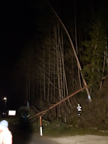 Die Streife der Straßenmeisterei war auf der L138 unterwegs und fand eine umgestürzte Weißkiefer zwischen den letzten beiden Wohnhäusern in Pernitz vor, deren Wipfel ca. 1,5 Meter in die Fahrbahn ragte. Der Mitarbeiter schnitt ihn ab sodass die Fahrbahn wieder frei war. Er bemerkte jedoch, dass diese Weißkiefer zwischen mehreren anderen Bäumen so gefallen war, dass sie eine ca. 15 Meter hohe Schwarzkiefer zusätzlich zum Sturm sehr stark belastete und diese auf eines der beiden Wohnhäuser zu stürzen drohte. Aus diesem Grund wurde die