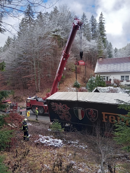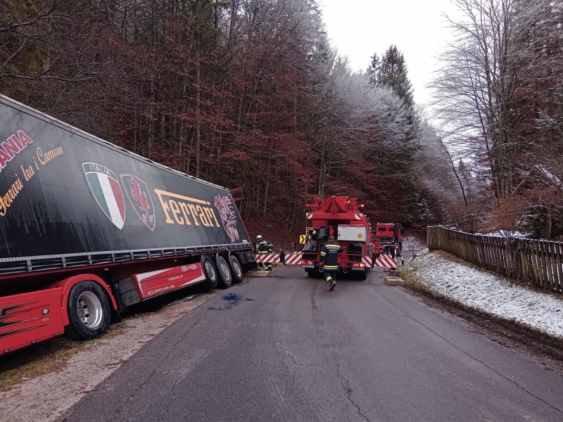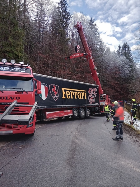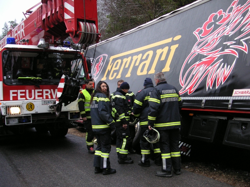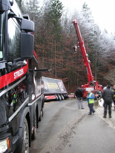 Der Einsatzleiter machte sich ein Bild über die vorhandene Situation. Ein Sattelzug kam auf Grund eines gezwungenen Manövers - lt. Lenker kam ihm ein Pritschenwagen mit hoher Geschwindigkeit in der Fahrbahnmitte entgegen – auf das aufgeweichte Bankett und blieb stecken. Aus dieser Lage konnte er sich aus eigener Kraft nicht mehr befreien. Die Zugmaschine hatte sich rechts vorne in das weiche Erdreich festgefahren, der Aufleger hatte gefährliche Schräglage.