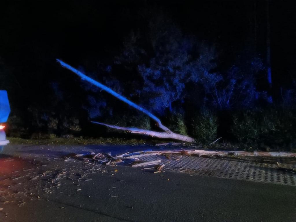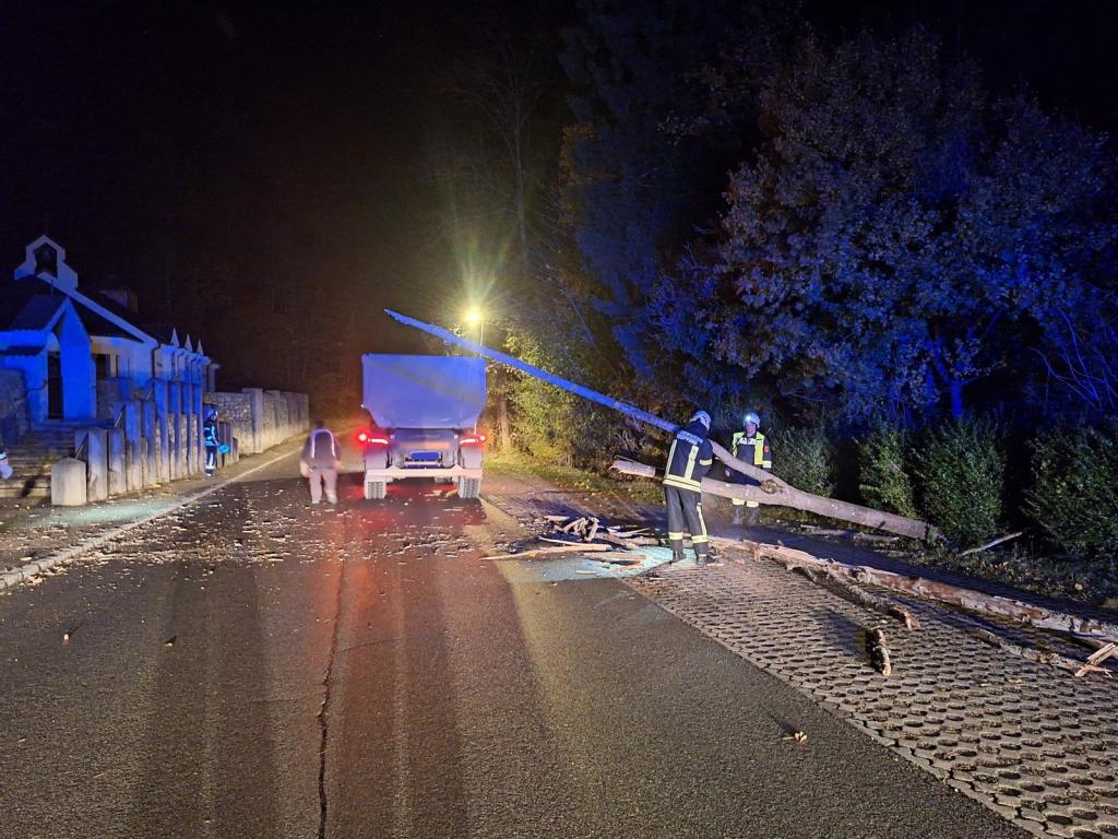 Der Sturm hat einen Baum entwurzelt, welcher auf der Landesstraße 4066 zu liegen kam und diese blockierte.