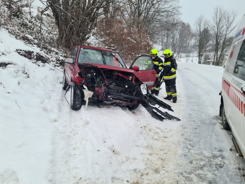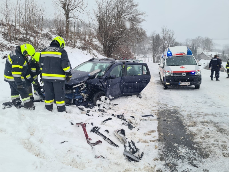 Zwischen Krumbach und Hochneukirchen auf der Hochneukirchenstraße (L146) in Höhe Buchegg kam es auf schneeglatter Fahrbahn zu einem Frontalzusammenstoß zweier Pkws. Beide Fahrzeuge wurden nach der Kollision schwer beschädigt in den Graben geschleudert.