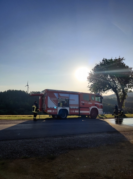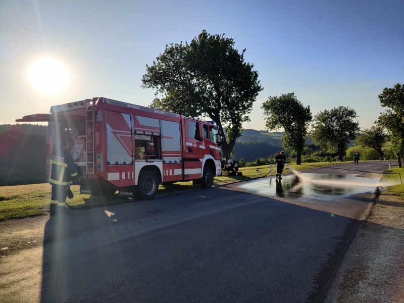 Da das schwer beschädigte Unfallwrack die gesamte Fahrbahn versperrte, begannen die Kameraden sofort mit der Absicherung der Unfallstelle und stellten den Brandschutz sicher. Danach wurden die ausgelaufenen Betriebsmittel gebunden, das Unfallwrack auf einen sicheren Abstellplatz verbracht und die Straße gesäubert.