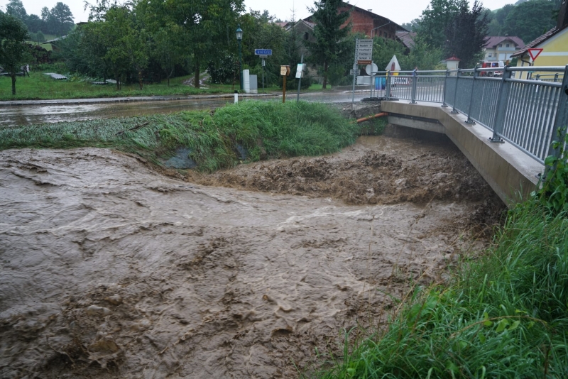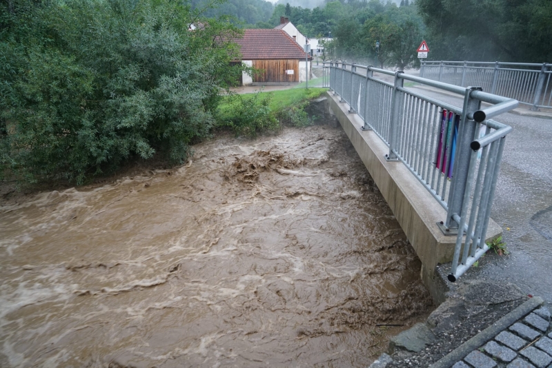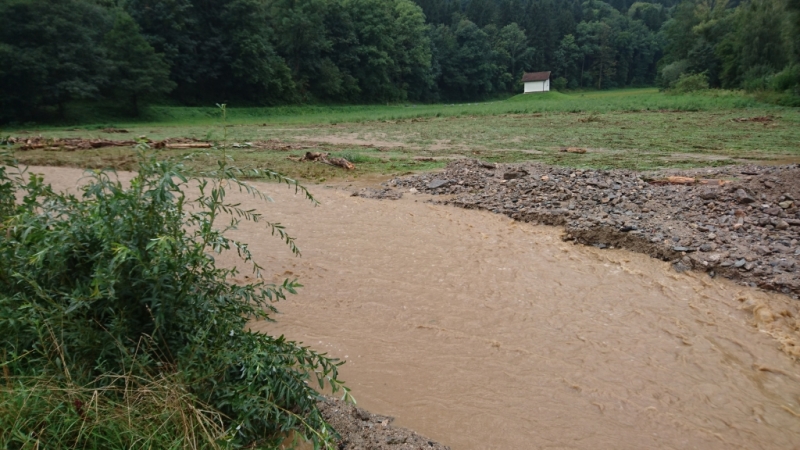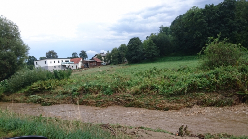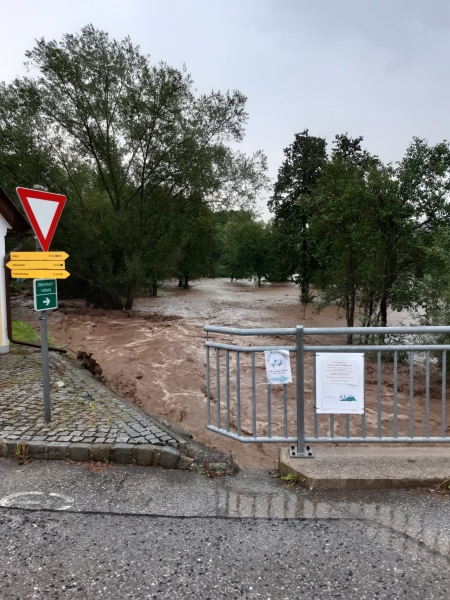 Um 14:00 Uhr wurde die FF Krumbach zu Auspumparbeiten in das Heimatmuseum Krumbach alarmiert. Zu dieser Zeit hatte es bereits rund 60 Liter/m² geregnet. Als das erste Fahrzeug im Einsatz war wurde Kdt. Simon von einem im Unterhaus wohnenden Feuerwehrmitglied verständigt, das der Lahmbach der durch den Ortsteil fließt über die Ufer getreten ist, und die Straße bzw. Felder überflutet werden.