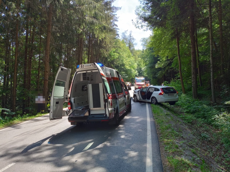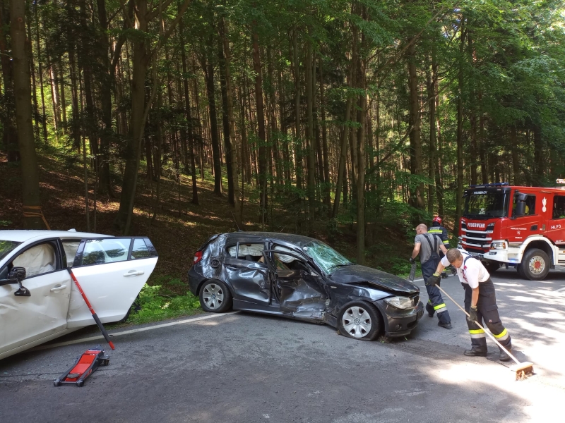Bei der Ankunft an der Unfallstelle auf der Hochneukirchenstraße stellte sich heraus das bei diesem Unfall 2 PKW beteiligt waren, wobei einer im angrenzenden Wald zu stehen kam. Die beiden leicht verletzten Lenker wurden bereits vom Roten Kreuz versorgt und danach in Krankenhäuser gebracht. Die Mitglieder der FF Krumbach sicherten die Unfallstelle ab und begannen nach der Freigabe durch die Polizei die Bergemaßnahmen durchzuführen. Der im Wald befindlich PKW wurde dabei mittels Seilwinde geborgen. Beide Fahrzeuge wurden durch ein Privatunternehmen von der Unfallstelle abgeschleppt. Im Anschluss wurde die Fahrbahn gereinigt und die der Straßenerhalter verständigt.