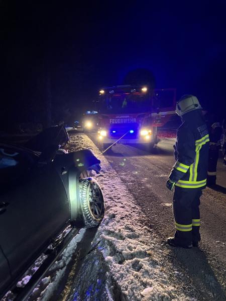 Aus unbekannter Ursache war ein PKW von der Fahrbahn abgekommen und frontal gegen einen Baum gekracht, durch die Wucht des Aufpralles wurde der PKW in den angrenzenden Wald geschleudert.