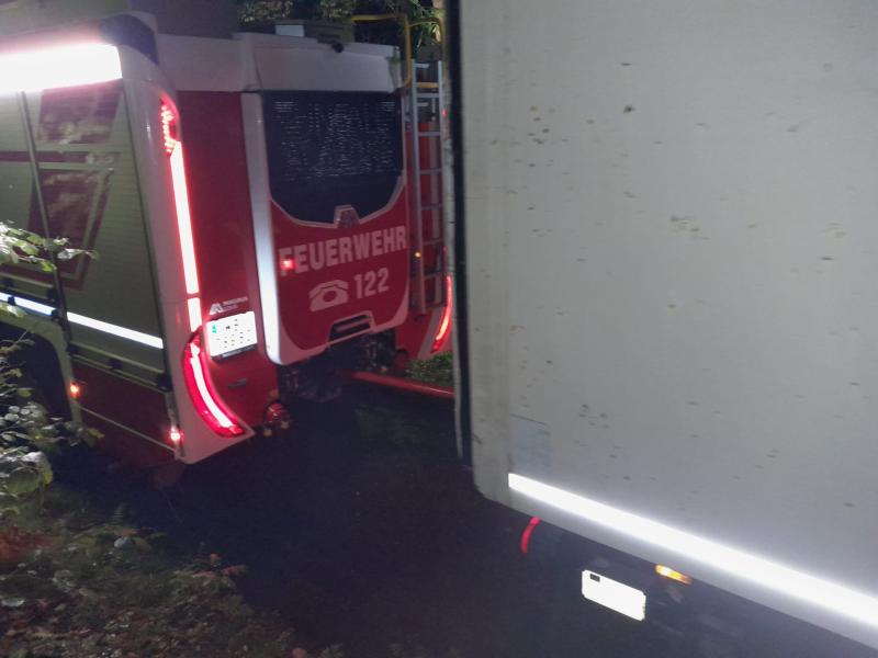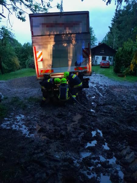 Die Mitglieder der FF Krumbach zogen den LKW mithilfe der HLF3-Seilwinde zurück auf die Zufahrt. Anschließend wurde der LKW mittels Abschleppstange auf den befestigten Güterweg geschleppt.