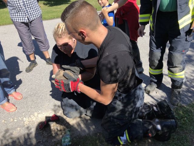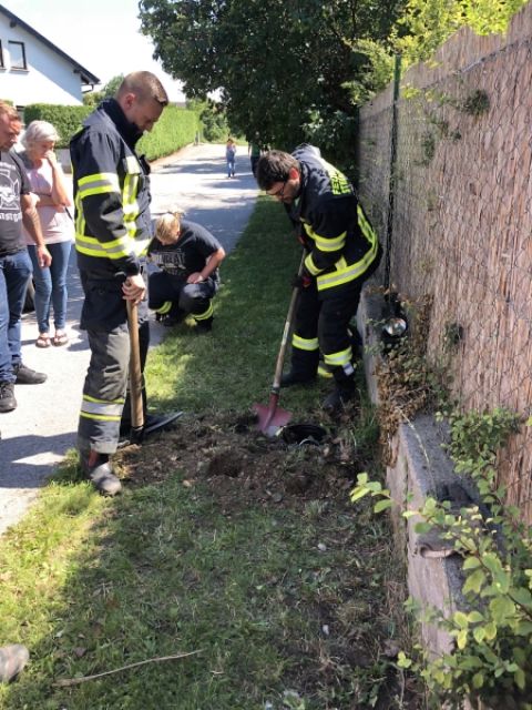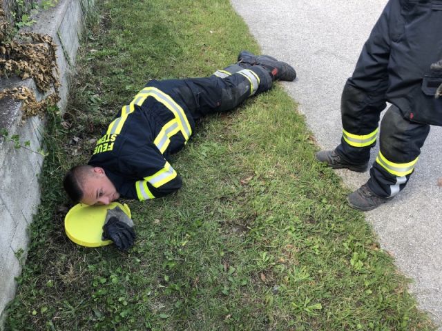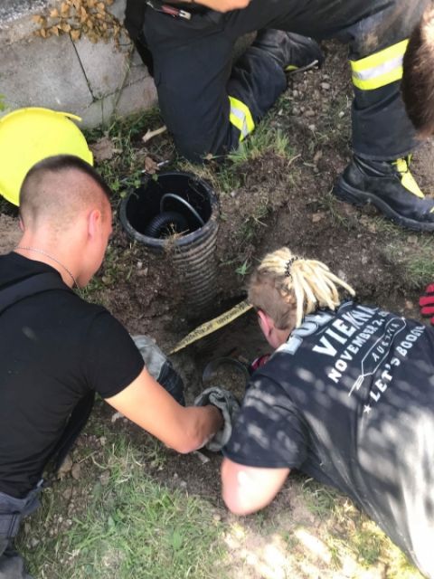 Nach dem Eintreffen der Feuerwehr wurde mehrmals versucht das Tier mit einer Hand zurück in den Schacht zu ziehen was aber nicht gelang. Festgestellt wurde, dass es sich um einen Igel handelt.