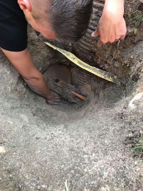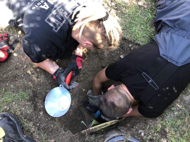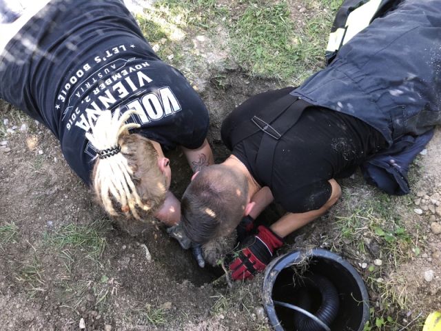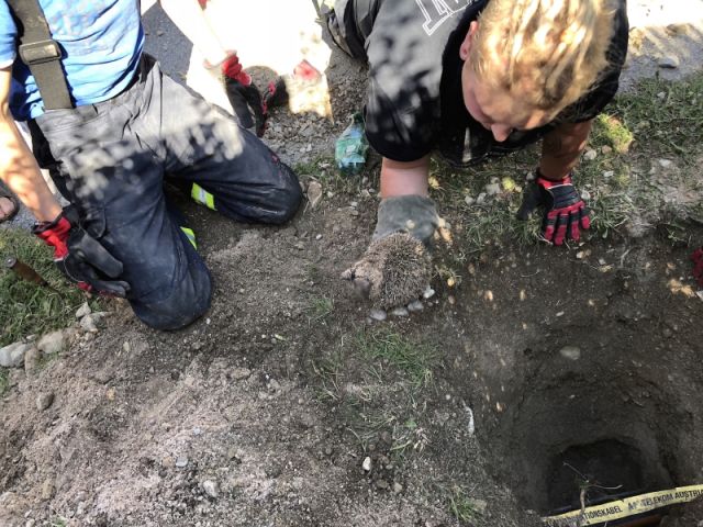 So wurde neben dem Kabelschacht ein „Rettungsloch“ mit einer Tiefe von rund 1 Meter händisch ausgegraben. Die letzten Zentimeter mussten um Verletzungen des Tiers zu vermeiden mit blosen Händen gegraben werden. Nach etwas mehr als 1½ Stunden war der Igel soweit ausgegraben dass er aus seiner misslichen Lage befreit werden konnte.