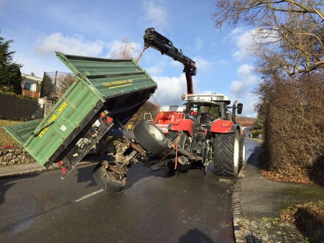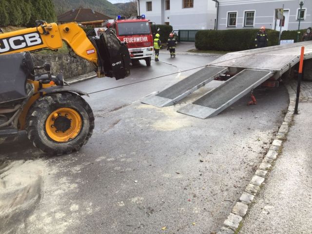 Gegen 12:50 Uhr wurde die Feuerwehr Markt Piesting zur Unterstützung bei der Fahrzeugbergung der Feuerwehr Muthmannsdorf alarmiert. Der umgestürzte Traktoranhänger wurde mittels Kran wieder auf die Räder gestellt und konnte anschließend durch das Zugfahrzeug von der Unfallstelle verbracht werden. Der schwerer beschädigte Telelader wurde mittels Seilwinde unter Rücksicherung mit einer weiteren Seilwinde aufgestellt und anschließend mit einem Tieflader einer Privatfirma abtransportiert. Nach Abschluss der Straßenreinigungsarbeiten konnten die Feuerwehren Markt Piesting und Muthmannsdorf wieder einrücken. Die L87 war für die Dauer der Berge- und Aufräumarbeiten gesperrt.