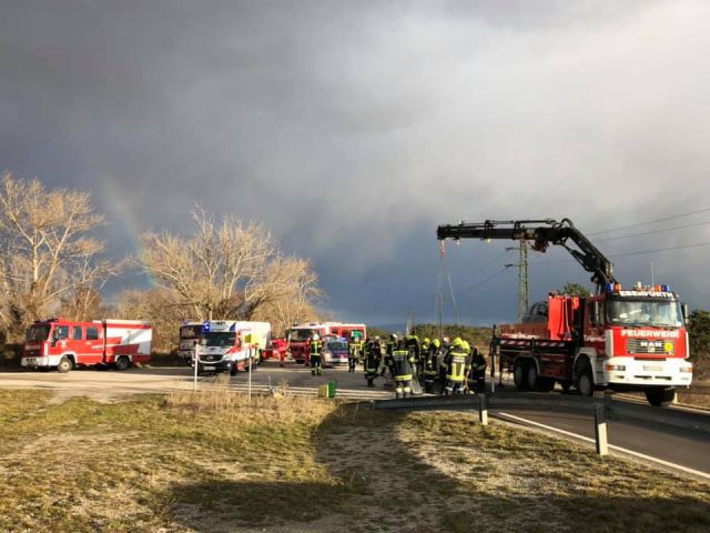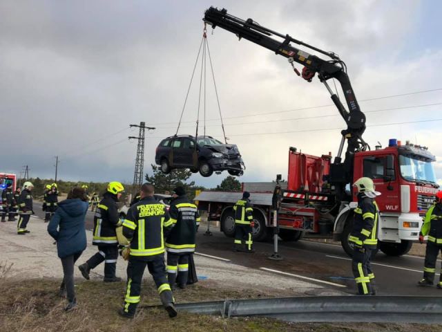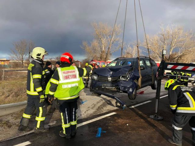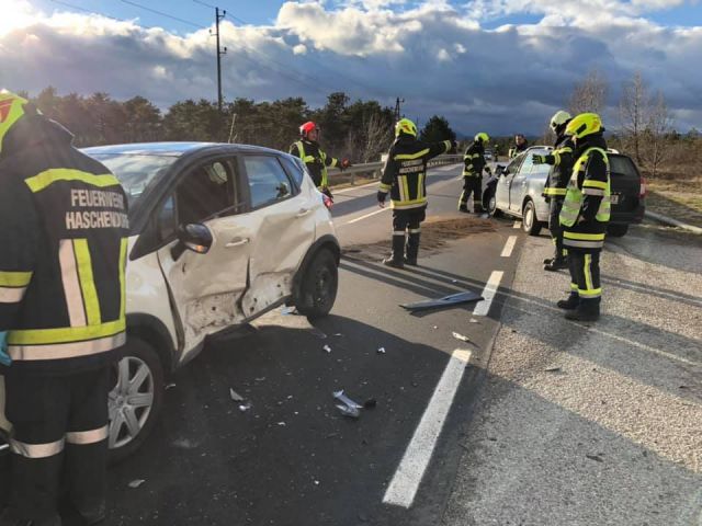 „Verkehrsunfall mit eingeklemmter Person“ lautet die Alarmmeldung am späten Nachmittag des 24.12.2018. Gemäß Alarmplan heulten um 14:00 Uhr in Haschendorf, Ebenfurth und Siegersdorf, die Sirenen und alarmierte die Freiwilligen Feuerwehren zur Menschenrettung auf der LH 159, Bereich Kanalbrücke.Beim Eintreffen von Tank 1 Haschendorf konnte vom Einsatzleiter der FF Haschendorf den weiter anrückenden Feuerwehrkräften Entwarnung geben. Beide Fahrzeuglenker, einer unbestimmten Grades verletzt, konnten sich selbst aus ihren stark deformierten Fahrzeugen befreien. Der anwesende Rettungsdienst hatte die Erstversorgung, und in weiterer Folge den Transport ins LKW Wiener Neustadt übernommen. Ein Fahrzeuglenker hatte, aus der Lenkgasse kommend, beim Einbiegen auf die LK159 ein Fahrzeug, aus Haschendorf kommend, übersehen. Das blaue Unfallfahrzeug touchierte seitlich, bei der Fahrertür das beige Fahrzeug. Beide Fahrzeuge blieben im Kreuzungsbereich liegen.