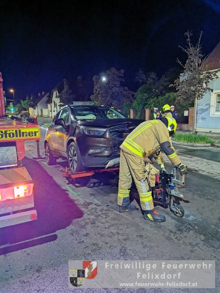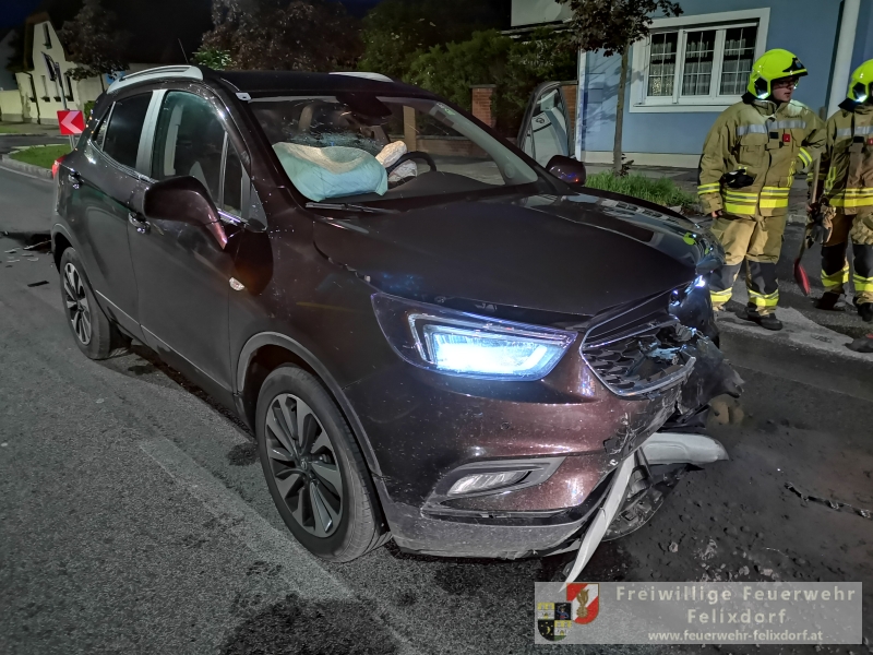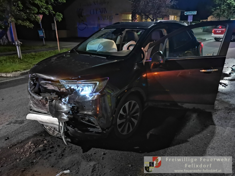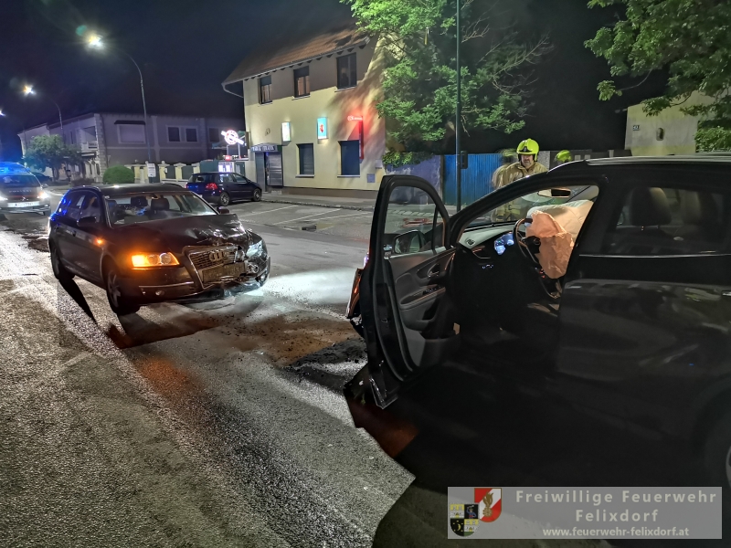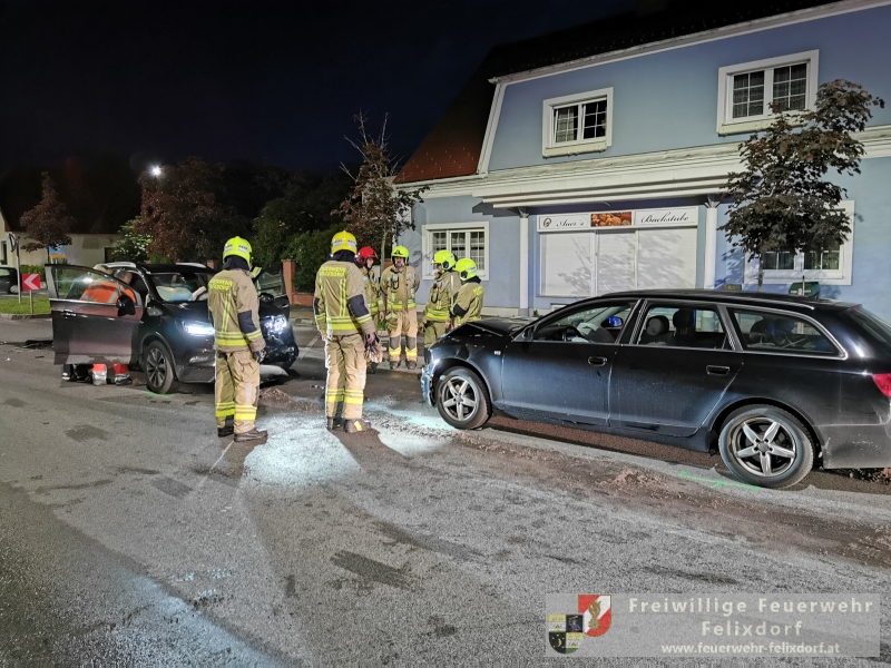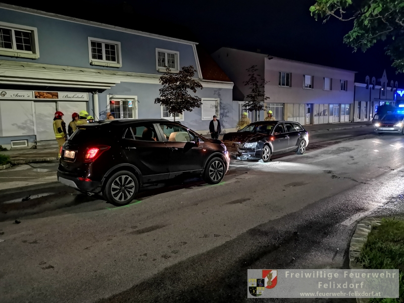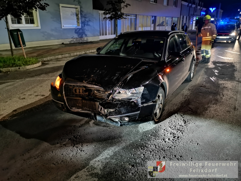 In den Abendstunden des 27.Mai 2019 kam es in Felixdorf an der Hauptstraße zu einem schweren Verkehrsunfall. Aus derzeit ungeklärter Ursache stießen zwei Fahrzeuge frontal zusammen. Ein zufällig vorbeikommendes Feuerwehrmitglied der Feuerwehr Felixdorf leitete gegen 21 Uhr 30 die notwendigen Notrufe ein. Ein PKW-Lenker wurde unbestimmten Grades verletzt und musste mit dem Roten Kreuz abtransportiert werden. Seitens Feuerwehr Felixdorf wurde sofort die Straße in beiden Richtungen gesperrt und Erstmaßnahmen gesetzt. Durch den enormen Aufprall kam es zu zahlreichen Betriebsmittelaustritten, diese mussten rasch gebunden werden um ein Ausbreiten in die Kanalisation zu verhindern. In weiterer Folge setzte die Polizei die erforderlichen Unfallerhebungen fort, nach Abschluss dieser Tätigkeiten erfolgte die Freigabe zum Abtransport der beiden massiv bzw. total geschädigten Fahrzeuge. Mittels Kran des Wechselladefahrzeuges und Abschleppachse wurde die Unfallstelle geräumt. Abschließend wurden die Verkehrsflächen endgesäubert und durch die Polizei für den Verkehr freigegeben. Nach knapp einer Stunde konnte der Einsatz beendet werden.Bericht & Fotos FF Felixdorf